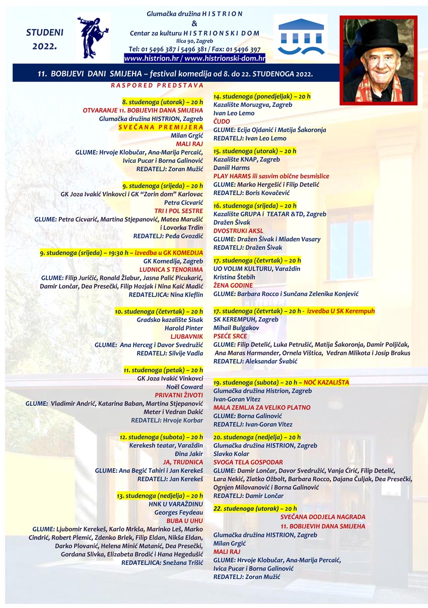 Istom predstavom, nakon svečane dodjele Bobijevih nagrada zatvaraju se 11. Bobijevi dani smijeha, u utorak 22. studenoga u 20 h.
