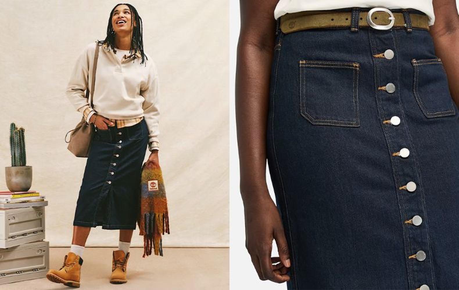 Za fashionistice koje su odrastale uz modni brend Timberland dobra vijest. U kolekciji jesen/zima 2024/2025 dolaze vrlo šik komadi nosivi u svakodnevnim prigodama. Uz majice, hudice i košulje posebna zvijezda ženske kolekcije je traper suknja s lagani elastinom koja prati dinamiku svake urbane žene. Model je povišenost struka sa simetričnim redom gumbi koji osim što predstavljaju dobar detalj za ostale stilizacije optički sužava siluetu.
