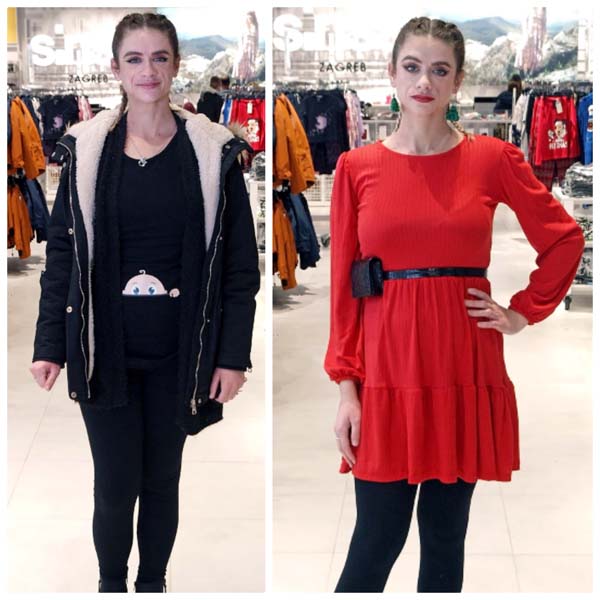 Što će odjenuti buduće mame? Naravno nešto lijepo, lepršavo u crvenoj boji. Alma je tako jednoj trudnici na makeoveru odabrala crvenu haljinu sa stiliziranim volanima i upotpunila je modnim detaljima – remenom koji u fokus stavlja trbuščić i novogodišnjim ukrasima.