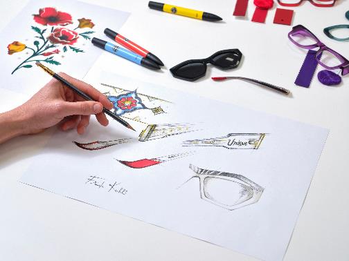 Rafiniranost estetskih detalja i harmonija oblika kombiniraju se s visokom kvalitetom materijala i preciznom tehničkom izradom. Jedan primjer je most i prednja gornja fronta nekih stilova koji reproduciraju ikonične Fridine obrve, naglašavajući njezin osobni stilski izbor, čin bunta protiv kulturnih i društvenih očekivanja povezanih s ulogom žena. Različite karakteristike ove umjetnice, LJEPOTA, BUNT, JEDINSTVENOST i SNAGA, postaju imena za dva sunčana i dva dioptrijska stila naočala te njen potpis, vidljiv s unutrašnje strane prozirnih krilaca. Kao i u njezinim djelima, paleta boja u kolekciji je intenzivna i hrabra s crnom, tamnosivom i bijelom kombiniranom s jakim potezima kista žute, crvene, ljubičaste, tamnozelene i ružičaste, u balansu blokova boja i prozirnosti, odabranih kako bi istaknuli i uokvirili ženska lica bez skrivanja.
