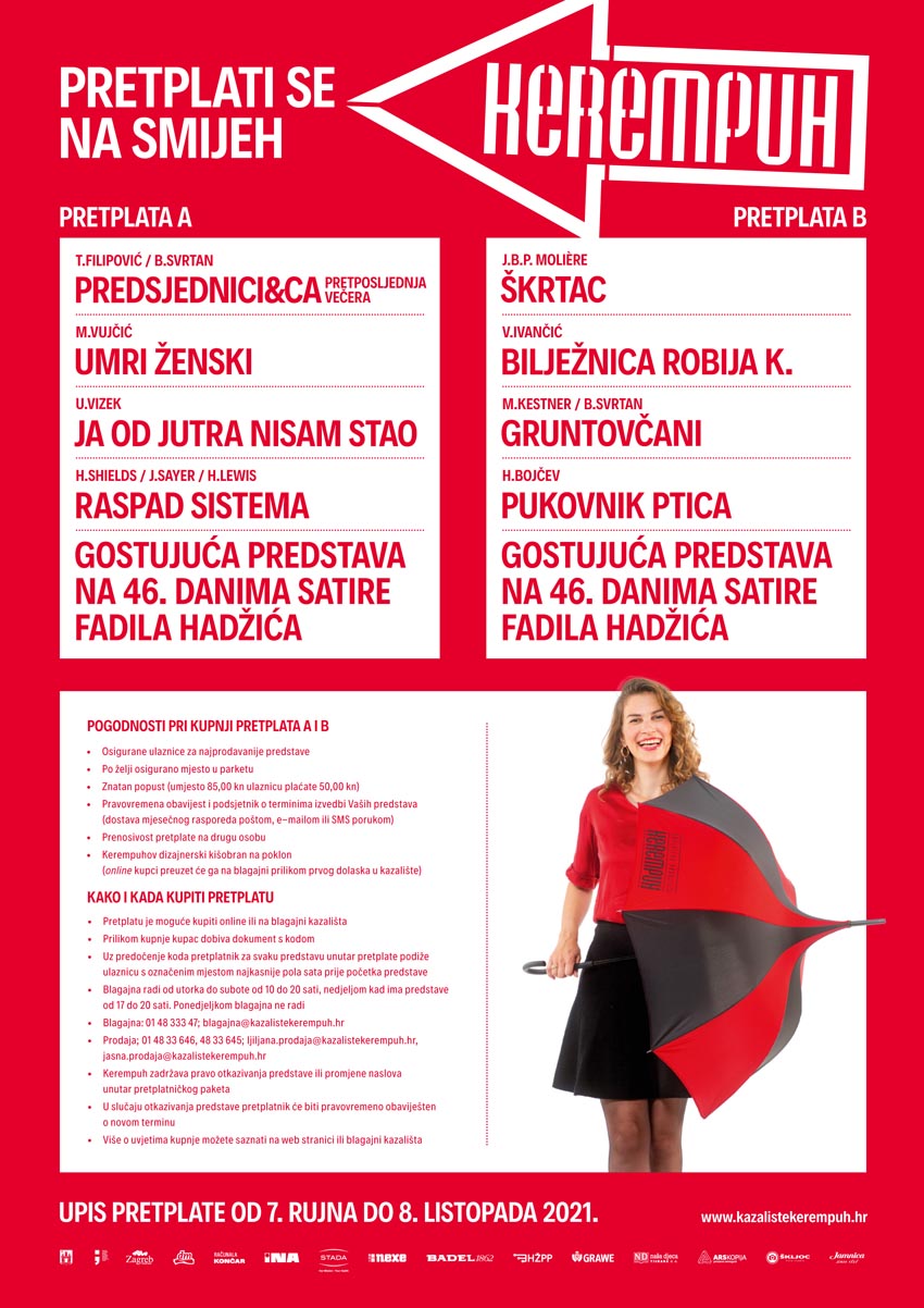 Satiričko kazalište Kerempuh u novoj sezoni po prvi put uvodi pretplate na svoje najpopularnije i najprodavanije predstave, kako bi vjernoj kazališnoj publici omogućilo značajne popuste pri kupnji ulaznica, uz mnoge druge pogodnosti.