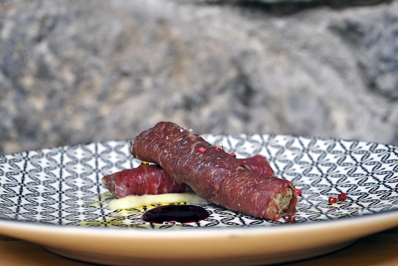 Za predjelo će tako ponuditi carpaccio od boškarina u kojem se nalazi pačja pašteta u koju je dodano pileće srce. Paštetu Željko radi na poseban način – sve se dinsta na kapuli i češnjaku, uz ružmarin, timijan jednostavne začine ovog kraja. Na kraju se ‘rolica’ servira na pireu od zelene jabuke i limete, te uz marmeladu od šumskog voća. Budući da se u Fortici pije i selekcija hrvatskih vina uz predjelo je Željko sljubio rose Rizman.