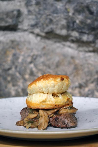 Glavna zvijezda svakako je odležani teleći biftek u umaku od vrganja koji su sotirani na maslacu, bijelom luku i vinu. Uz njega je Željko poslužio torticu od lisnatog tijesta u kojem se nalazi plemeniti sir. Uz glavno jelo odlično se sljubljuje Teran Tomaz.