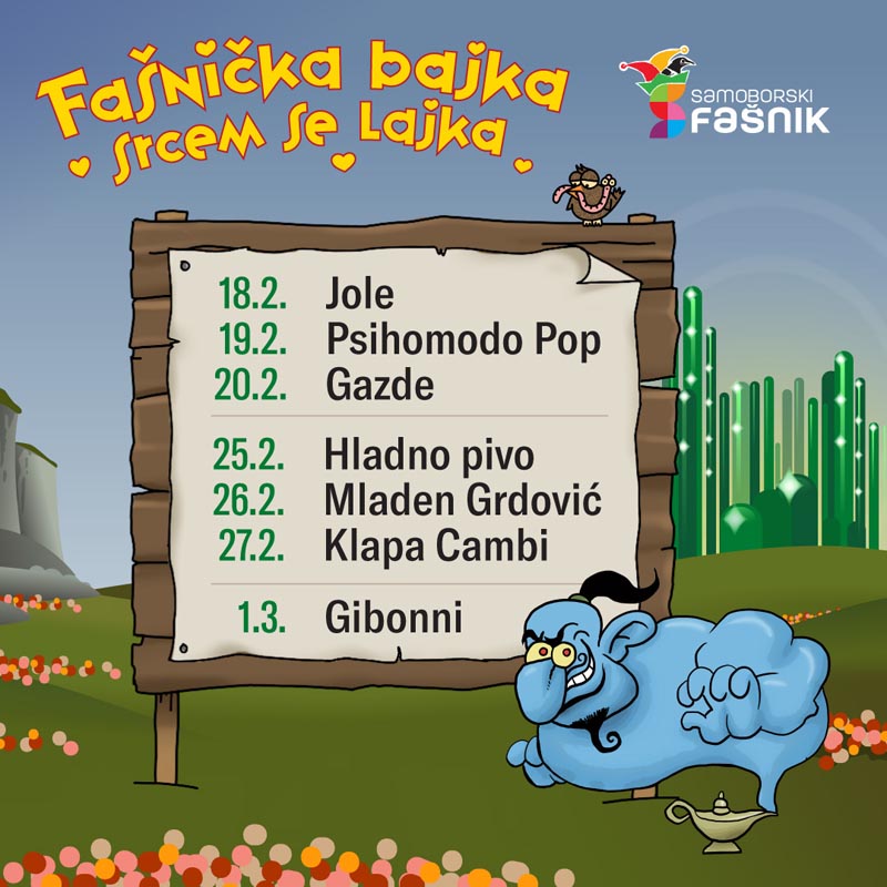 Samoborski fašnik velika je proslava koja će trajati dva tjedna. Pjevač Jole 18. veljače otvara koncertni program, a idućih dana moći ćete uživati i u nastupima Psihomodo Popa, Hladnog piva, Gibonnija i mnogih drugih, gledati organizirane fašničke povorke te sudjelovati u aktivnostima za djecu među kojima je Srakotrk, orijentacijsko trčanje, postalo tradicionalno.