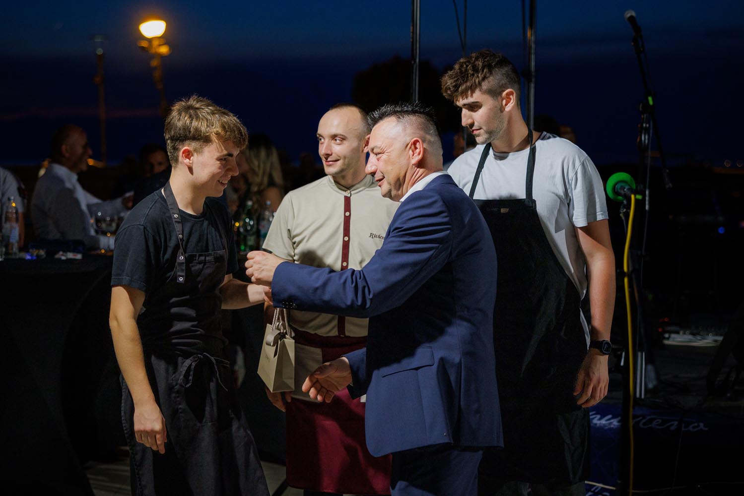 Klapa Tramuntana dala je večeri poseban šarm izvedbom pjesme “Otok od soli”. Prekrasan uvod večeri dala je Ana Marija Lesica koja je ispričala o povijesti restorana i obitelji. Prisutnima se obratila i načelnica općine Omišalj Mirela Ahmetović kao i gradonačelnik grada Krka Darijo Vasilić. Imali smo prilike čuti i direktoricu TZ Kvarnera Irenu Peršćić Živadinov kao i direktora Hrvatske turističke zajednice Kristjana Staničića.