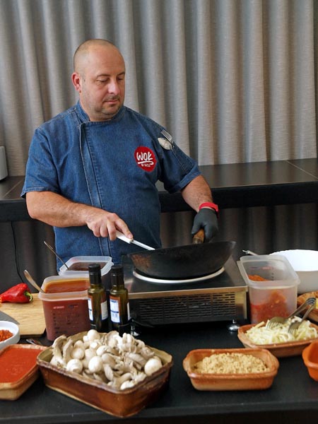 Posude sa sojinim klicama, bambus kriškama, Jalapeño papričicama, tartufatom, crvenim rog paprikama, šampinjonima, šumskim gljivama i ostalim divotama, te onim najvažnijim: piletinom brenda Međimursko pile koja je bez antibiotika a koju Matija odnedavno koristi u pripremi svih wokova s piletinom! Kad odabere kombinaciju sastojaka, na wok tavu dodaje rezance koje svakodnevno sam radi: od domaćih jaja, brašna koje je mljeveno u domaćem mlinu, dok u one tamne stavlja sipino crnilo. Dakako, o umacima ne treba niti govoriti, jer oni najviše daju okus jelima iz woka a sve ih Matija sam priprema. Prilikom svake narudžbe možete odabrati svoju kombinaciju okusa, sastojaka i rezanaca/riže a za one koji žele iskušati jesen na tanjuru, Matija u fokus stavlja tri nova okusa kojima je teško odoljeti.