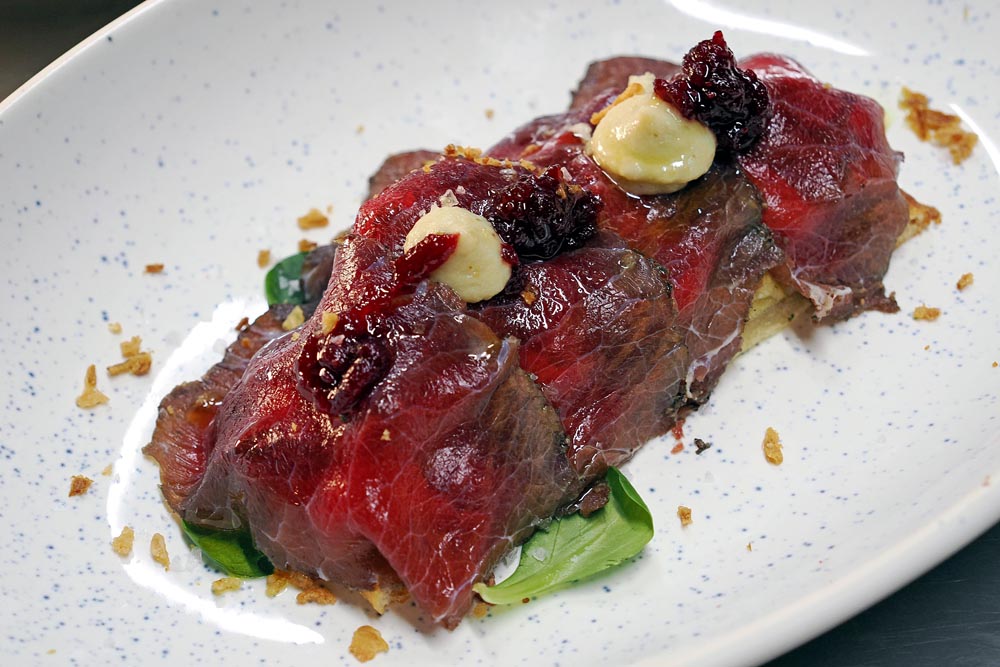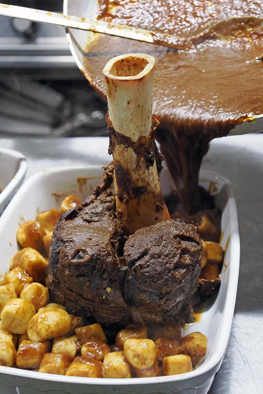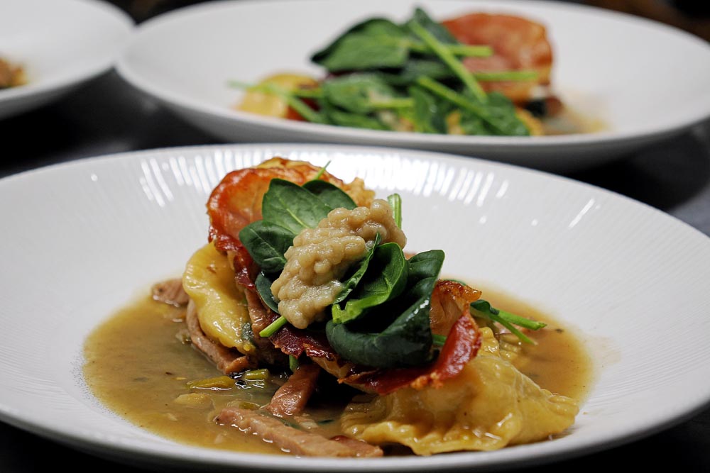 “Kvarnerska kombinacija kobasica, kiselog tijesta i kruha u mojoj su kreaciji ravioli punjeni kobasicama s umakom od kiselog zelja i slanine.Raviole radimo ručno svakog dana, a punimo ih sezonski. Iako se na prvu čini hrabro pojesti paštu s umakom od kiselog zelja kojeg mnogi jedu kao prilog, pustna pašta je ono nešto što naši gosti obožavaju ove zime” – kaže Željko polako pripremajući drugi, nešto kompaktniji tanjur. Kao zvijezda pustnog menija dolazi juneća koljenica 48 sati sporo pečena u takozvanom roštilju green egg (zatvoreni sustav) stabiliziranom u crvenom vinu od kojeg nastaje umak za domaće njoke. Ovaj se specijalitet priprema za više ljudi, a kako biste bili sigurni da ćete u njemu i uživati najavite se Fortici prije.
