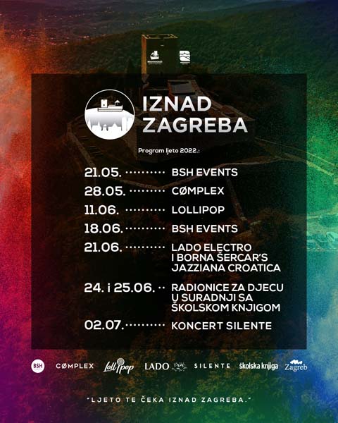 Počinje novi kulturno – zabavni projekt Iznad Zagreba. Gotovo svakog vikenda ovog proljeća i ljeta, od 21. svibnja pa sve do kraja rujna, na Medvedgradu nas pod vedrim zagrebačkim nebom očekuju koncert Ansambla LADO i Borna Šercar’s Jazziana Croatica, partiji BSH, Lollipop i Complex, koncert grupe Silente, radionice za djecu i još mnogo toga.