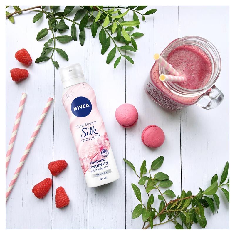 NIVEA SILK Mousse Rhubarb Raspberry pjena za tuširanje s neodoljivim mirisima rabarbare i maline već prilikom prvog susreta djeluje magično na naša čula.