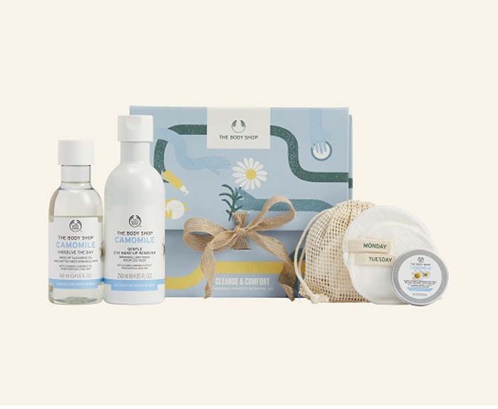 Cleanse & Comfort Camomile Makeup Removal Kit je prekrasna kombinacija proizvoda za skidanje šminke s lica. Glavna zvijezda je Cleanse & Comfort Camomile ulje za čišćenje, blagi skidač šminke s očiju iz iste linije, Camomile Cleansing Butter i ekološki prihvatljive blazinice od pamuka i bambusa za skidanje šminke.