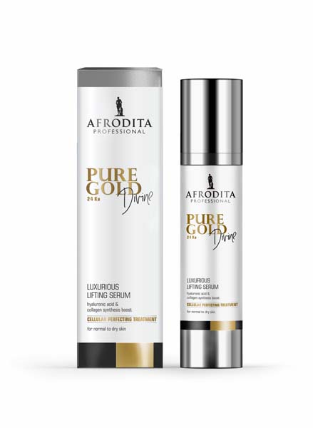 Pure Gold DIVINE raskošni LIFTING SERUM predstavlja savršenstvo; u njemu su spojeni najnoviji rezultati znanosti, najbolji aktivni sastojci i veliko kreativno nadahnuće. U njemu se nalazi više od 50 pomno odabranih aktivnih i ostalih podupirućih, hidratantnih i njegujućih sastojaka koji djeluju na pomlađivanje kože (5,5 godina mlađi papilarni dermis), smanjenje bora na području čela, vanjskog predjela oko očiju i vrata. Jednostavno najbolja sinergija aktivnih sastojaka.