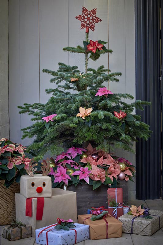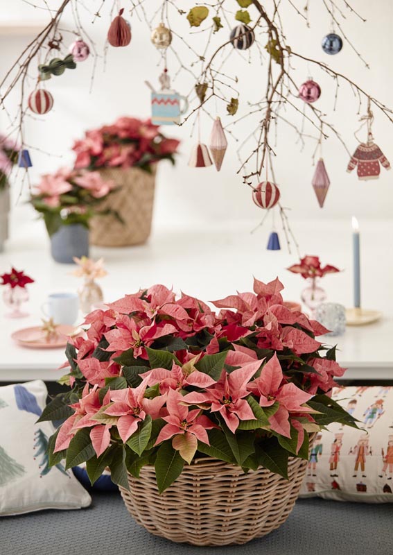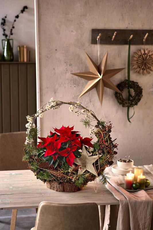 Božićno drvce neizostavni je blagdanski simbol, a upravo božićne zvijezde mogu biti savršen prirodni ukras kao rezano cvijeće, ili u obliku kokedama. Da biste napravili kokedame, izvadite male božićne zvijezde iz njihovih posuda i omotajte korijensku balu mahovinom. Pričvrstite ih finom žicom i okačite na drvce. Savjet: temeljito zalijte korijenske bale biljaka prije omatanja mahovinom. Ovako postavljene mini božićne zvijezde pažljivo zalijevajte odozgo ili ih pak stavite nakratko u posudu s mlakom vodom, no prije toga obavezno uklonite mahovinu s korjenove bale i zatim ju poslije natapanja ponovno vratite. Božićne zvijezde odličan su ukras i na poklonima. Savjet: rezane božićne zvijezde stavite najprije u cvjetnu cijev napunjenu vodom ili ih omotajte zelenom cvjetnom trakom. Kako biste zatvorili odrezane vrhove, stabljike na nekoliko sekundi uronite u vruću vodu (oko 60°C), a zatim u hladnu.