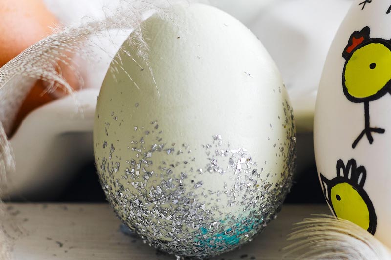 Dodavanje ukrasa, poput ovakvih srebrnih ljuskica trend je u interijerima. Najčešće se nalazi na slikama i pločicama ali i detaljima poput pisanica. Svako jaje je potrebno obojati u željenu boju te dok je boja još mokra uroniti u detalje koje želite trajno na ljuskama jajeta.