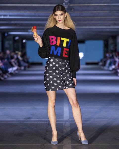 Odjeća je upotpunjena pismo torbama neklasičnih dimenzija kao i trendovskim „bucket hat“ šeširićima od trapera i glittera. Od tkanina uz nezaobilazni traper korišteno je i puno lepršavih viskoza, žoržeta, batista i printanih popelina. Predstavljeno je i nekoliko jednobojnih komada poput kombinezona s volanima i širokim nogavicama u crvenoj boji te maxi haljina u kraljevsko plavoj boji. I ovog puta nezaobilazni BITE ME natpis apliciran je na majice i haljine, a svako slovo je ručno izrezano od različitih tekstura i boja tkanina kako bi postigli zanimljivi patchwork efekt. U ovoj se sezoni Aragović okušao u dizajnu i muških modela pa je tako pistom prošetalo nekoliko upečatljivih kreacija u dnevnim casual varijantama i to bomber jakne, kratke traper hlače te košulje neobičnog printa, kao i sportska varijanta s prepoznatljivim BITE ME natpisom.